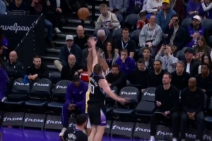 场边库里看高兴了!小佩顿外线连中两记三分球 勇士领先19分打停