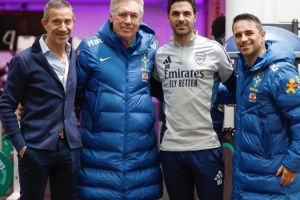 巴西队在阿森纳基地进行训练,安切洛蒂训练之前与阿尔特塔合影,巴西队社媒晒出照片。