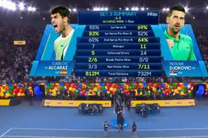 第5局比赛德约发球局,阿尔卡拉斯40-15拿到2个破发点,并在第一个破发点就兑现成功。阿尔卡拉斯3-2领先!