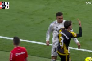 罗德里戈被推倒后,姆巴佩迅速上前为队友出头,与查瓦利亚对峙。
