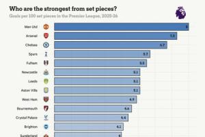 本赛季英超定位球效率榜(每100次定位球机会):