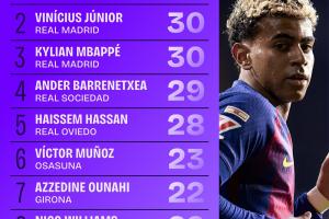体育资讯11月12日讯 巴萨亚马尔、皇马的姆巴佩和维尼修斯,他们在过人突破方面,都有着非凡的天赋。在2025-26赛季西甲联赛中,据Squawka数据统计,亚马尔在过人次数排行榜单居首。