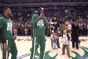 体育资讯2月7日讯 在今日雄鹿对阵步行者的赛前。波蒂斯携手字母哥哥向字母哥致敬,并祝他连续10次进入全明星阵容。