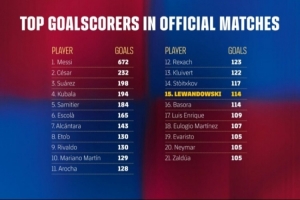 截至目前,在巴萨效力了三个半赛季的莱万共计为球队打进了114粒正式比赛进球,在俱乐部历史射手榜上追平了巴索拉,并列第15位。