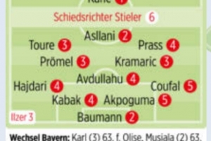 体育资讯2月9日讯 德甲第21轮比赛,拜仁主场5-1击败霍芬海姆,德国媒体《图片报》对两队球员进行了评分。