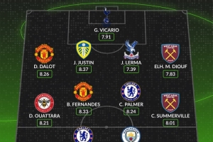 中场:瓦塔拉(布伦特福德,8.21分)、B费(曼联,8.33分)、帕尔默(切尔西,8.24分)、萨默维尔(西汉姆联,8.01分)