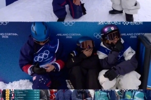 “头条新闻”微博报道了比赛中有趣的一幕,据悉在该项目最后一个选手上场前,领奖台候选人前三名因紧张而蹲在一起“抱团取暖”,画面非常有趣引人关注。