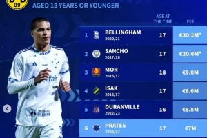 体育资讯2月19日讯 多特已经官宣签下克鲁塞罗17岁后卫普拉特斯,德转统计显示他也是多特队史第6贵的U18引援。