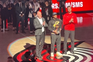 利拉德带着第三座三分大赛奖杯回到波特兰,并在主场球迷欢呼中举起了奖杯。