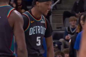 场边库里看高兴了!小佩顿外线连中两记三分球 勇士领先19分打停