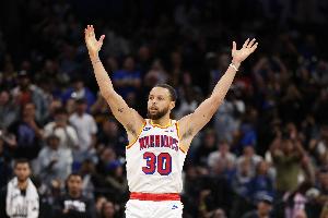 场边库里看高兴了!小佩顿外线连中两记三分球 勇士领先19分打停