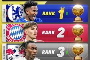 体育资讯02月28日讯 Score90给出了2026年金童奖2月份最新排名预测,埃斯特旺升至榜首,卡尔第二,迪奥曼德升至第三。