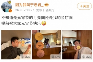 宁忠岩在社媒配文写道:“不知道是元宵节的月亮圆还是我的金饼圆。提前祝大家元宵节快乐!”