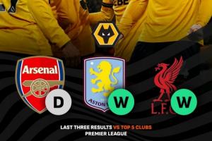 回看狼队最近3场主场,狼队2-2平了阿森纳,2-0拿下维拉,2-1绝杀利物浦。垫底的狼队,近期拿出了极其强势的表现!
