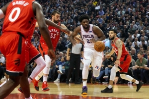 2019年东部半决赛,恩比德场均17.6分8.7篮板3.3助攻,投篮命中率仅37%。