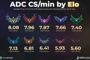体育资讯3月9日讯 外媒统计单排各分段ADC玩家分均补刀: