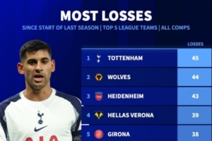 体育资讯3月11日讯 根据德转统计,热刺是上赛季以来五大联赛输球最多的球队,各项赛事一共输掉45场。