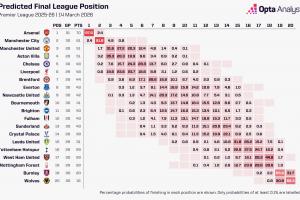 据OPTA利用超级计算机进行的10000次模拟,阿森纳夺得英超冠军的概率为97.6%,曼城夺冠概率为2.4%。