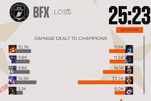 体育资讯3月17日讯 今日2026先锋赛组内赛BLG与BFX战至第五局,而在第四局比赛中BLG下路VIper最终在本局游戏内一人独揽33.5K的恐怖伤害,这要比BFX上中野三人加起来还高。