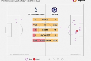 体育资讯11月2日讯 英超第10轮比赛,热刺在主场以0-1的比分不敌切尔西。本场比赛,热刺的预期进球数仅为0.05。