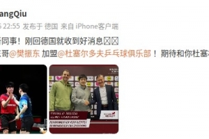 邱党欢迎樊振东:欢迎东哥加盟杜塞尔多夫!期待和你杜塞相见!