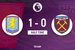 伤停补时3分钟。上半场比赛结束,阿斯顿维拉1-0西汉姆。
