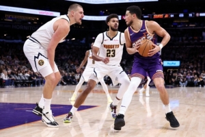 太阳本赛季至今战绩为40胜32负,场均得112.2分,场均失111.2分。上场比赛,太阳主场120-98大胜猛龙,球队结束5连败。杰伦·格林20分3篮板7助攻,布克25分3篮板6助攻,吉莱斯皮16分4篮板3助攻,乔丹·古德温14分7篮板。本赛季太阳主场战绩23胜14负。进入3月份以来,太阳6胜6负。本场罗伊斯·奥尼尔大概率出战,格雷森·阿伦出战成疑,狄龙·布鲁克斯、马克·威廉姆斯、阿米尔·科菲、海伍德·海史密斯缺席比赛。太阳目前的排名比较微妙,最后10场常规赛球队无疑会全力冲击前6,力争直接晋级季后赛。近期缺少了多名主力的太阳比较依赖杰伦·格林和布克双子星的发挥。往绩看,太阳面对掘金已经4连败。