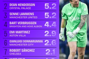 以下为本赛季英超门将阻止进球榜top10: