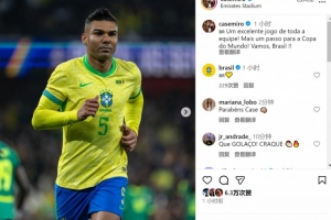 卡塞米罗社媒晒出比赛照片,写道:“全队都表现出色,向世界杯又迈进一步!加油巴西!”