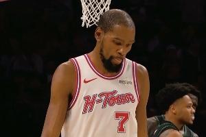 火箭进攻,杜兰特持球造成犯规站上罚球线但是第一罚罚丢。随后杜兰特第二罚故意罚丢,森林狼将球打出底线,最后1.1秒火箭获得前场底线球发球机会。