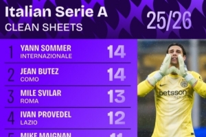 体育资讯4月3日讯 足球数据网站Squawka统计本赛季意甲门将零封榜,索默14次第一,迈尼昂第五,迪格雷戈里奥第七。