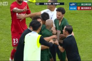 比赛第88分钟,浙江外援米特里策用手拉李镇全头发,主裁查看VAR后直红将米特里策罚下。米特里策非常愤怒,想要冲上去找裁判理论,队友赶紧把他拉住。