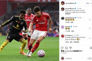 体育资讯11月2日讯 英超第10轮比赛,内科-威廉姆斯踢满全场,帮助诺丁汉森林主场2-2战平曼联。