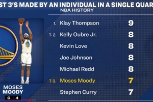 据统计,穆迪单节7记三分,与库里并列历史第三多,NBA历史单节三分纪录由克莱保持(9记)。