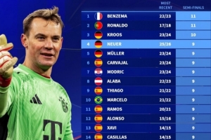 体育资讯4月16日讯 今天凌晨,拜仁淘汰皇马进入欧冠四强,诺伊尔已经9次参加欧冠四强,并列第三。