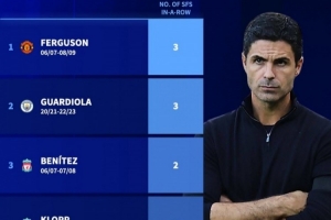 统计表明,阿尔特塔成为历史上第五位连续带队进入欧冠四强的英超主教练,在他之前,只有弗格森(2006-07赛季至2008-09赛季连续3次)、瓜迪奥拉(2020-21赛季至2022-23赛季连续3次)、贝尼特斯(2006-07赛季至2007-08赛季连续2次)和克洛普(2017-18赛季至2018-19赛季连续2次)做到过。