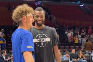 赛前,勇士后卫波杰姆斯基找到了热火球员、前队友维金斯,两人笑着寒暄了数句。