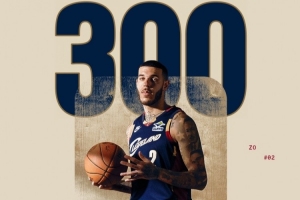 比赛首节,骑士球员朗佐·鲍尔替补出战。球队官方也晒出海报,祝贺鲍尔达成生涯300场里程碑。