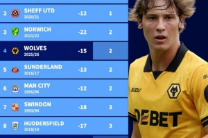 1、谢菲联23/24赛季,1分,-22球(降级)