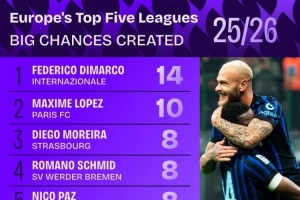 本赛季五大联赛创造重大机会排名: