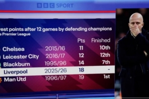 利物浦本赛季英超前12轮比赛仅积18分,成为英超历史同期积分第四少的卫冕冠军。