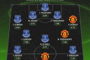 中场:詹姆斯·加纳 (埃弗顿, 7.00分)、基尔南·迪尤斯伯里·霍尔 (埃弗顿, 6.91分)、布鲁诺·费尔南德斯 (曼联, 7.08分)