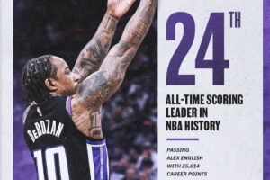此役过后,德罗赞生涯总得分来到了25629分,超越了英格利什,来到NBA历史第24位,将追赶卡特(25728)。
