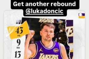 赛后湖人球员拉拉维亚晒出东契奇的数据海报,他调侃道:“你多抢个篮板啊。”