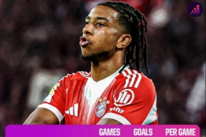 1、拜仁 19场65球,场均3.42球