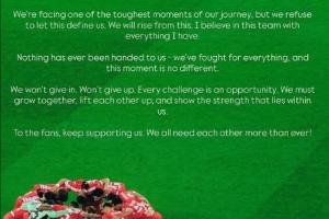 范戴克写道:我们正面临旅程中最艰难的时刻之一,但我们拒绝让这一切定义我们。我们将从中崛起。我全心全意相信这支球队。