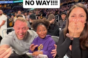 体育资讯11月28日讯 一位网友在Instagram上晒出了近日他们一家三口去观看湖人主场比赛时的花絮。