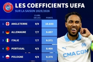 体育资讯11月29日讯 德国转会市场列出了本赛季欧战积分排名,英超、德甲前两位,意甲升至第三位。