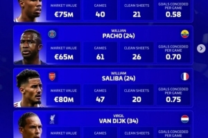 萨利巴(阿森纳,24岁,法国):身价8000万欧,47场,20零封,场均丢0.75球