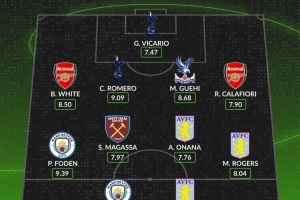 中场: 福登(9.39分,曼城)、马加萨(7.97分,西汉姆联)、阿马杜·奥纳纳(7.76分,维拉)、摩根·罗杰斯(8.04分,维拉)